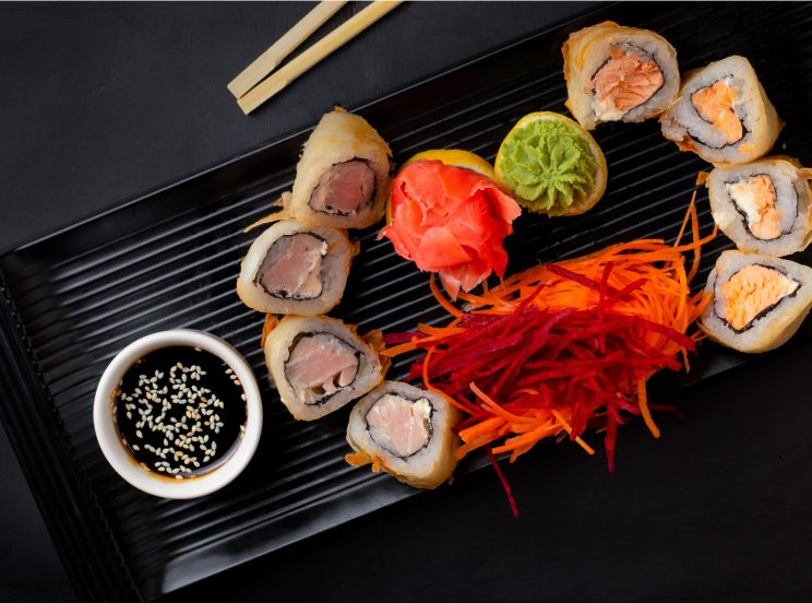 Avocado, lime, salmon, mushrooms and garnish served with pickled ginger and spring onions.